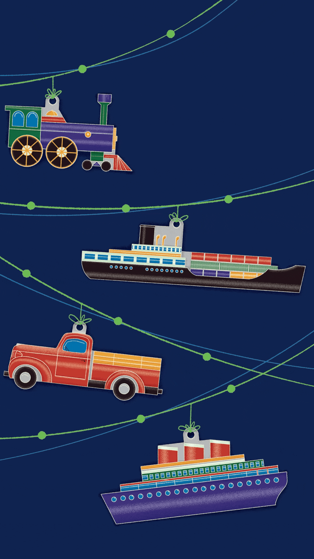 Port NOLA requested a printed holiday card and matching animation that showcased the modes of transportation the port handles daily: rivers (cruise and cargo ships), rails, and roads. I illustrated vintage metal ornaments, then created an animated version to be used on social media and the holiday email.